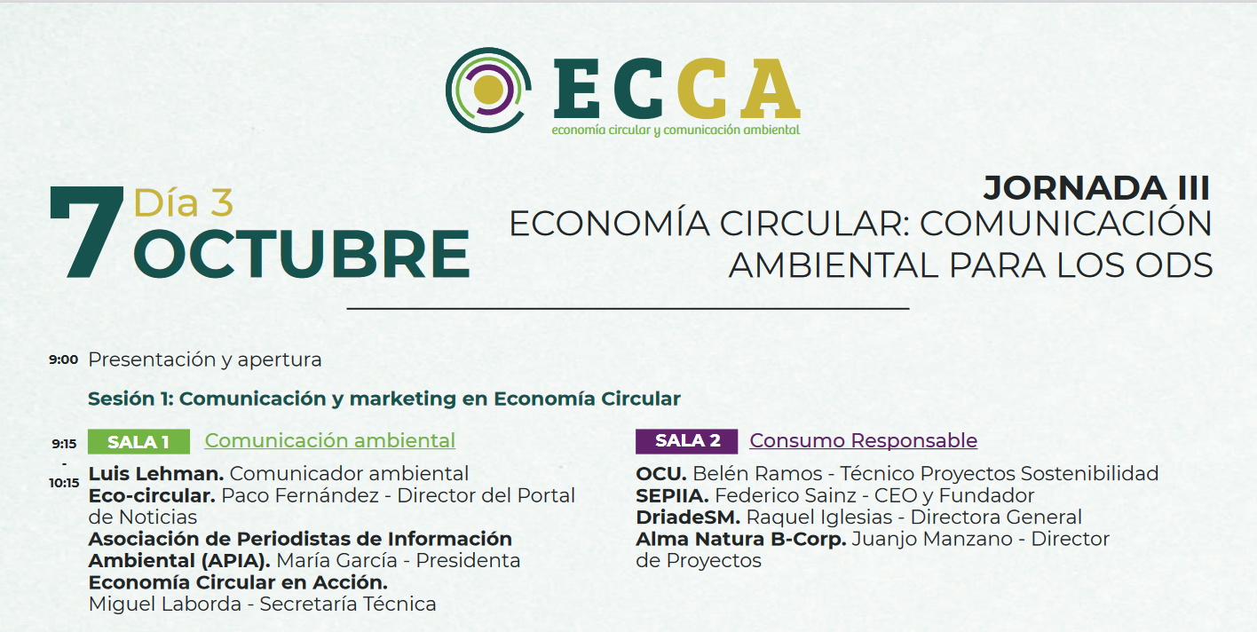 ECCA, que tendrá lugar los próximos días 5, 6 y 7 de octubre en Sevilla siendo además emitido en streaming, será el primer congreso nacional de economía circular y comunicación ambiental, donde se darán cita líderes empresariales y gubernamentales para desarrollar ideas circulares, circularizar modelos de negocio y entrar en contacto con todos los agentes del sector. Más de 70 expertos del más alto nivel de la Administración, la Economía, la Ciencia y la Comunicación contarán cómo la Economía Circular es una oportunidad para todos.